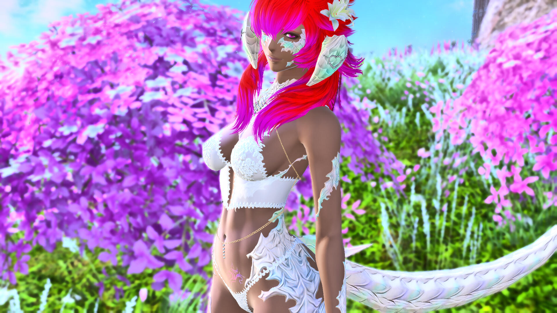 Born and raised in Radz-at-Han, Banadiel was quickly known as the "problem child" in the city. With both parents constantly working and her older sister looking after a sickly younger brother, she often wandered off on her own. The Raen middle child eventually disappeared into the Thavnairian jungle. She was raised by Arkasodara foster parents until she was strong enough to leave the island on her own power. Upon returning home, she discovered her older sister had been charmed away by a Xaela traveler and left to search for her.Adventuring to Eorzea was not without its risks. She was almost taken as a slave multiple times by pirates as she made her way to Eorzea. Banadiel lived for a few years in Gridania, doing odd jobs for the Yellow Adders and Scions of the Seventh Dawn. During this time she searched for news of her sister.On her first visit to Mor Dhona, the Raen was ambushed by Garleans and had her tail blown off in the skirmish. She was taken prisoner and held in a facility inside the Praetorium, where the Garleans experimented on her with Allagan prosthetic technology, replacing her tail and..other parts. She was eventually saved by adventurers when the Praetorium fell. Banadiel eventually regained herself after the trauma, but the Garleans left a hunger in her that couldn't be satisfied by normal means.Banadiel fell heavily into prostitution to deal with her needy libido, eventually falling into a trap in Central Coerthas and sold as a slave. Her Ishgardian noble owner was murdered a few days after her purchase, and Banadiel was framed as the culprit. As she awaited execution, she was saved by the remnants of the Scions of the Seventh Dawn. Hired as a bodyguard, she escorted Alphinaud Leveilleur during the events of the Dragonsong War.Once freed from her duty, Banadiel ventured to the Far East to the Azim Steppes. She met her sister, who was living with the traveler. Banadiel was shocked to learn she had a niece. During this time the Domans were trying to establish alliances with the Xaela tribes, and Banadiel fell into helping the Scions of the Seventh Dawn once again.During the conflict at Doma Castle, she was unable to save her sister's mate from heavy gunfire. The wounds left him disabled, and though victory was assured, Banadiel's sister disowned her for failing to protect the man she loved. Many drinks and bad decisions later, Banadiel left the Steppes.The Raen wandered for a while, getting back at the Garleans however she could, whether it be in the battlefields at Bozja or in small skirmishes along the borders. She participated in the Eorzean's Alliance's attack on the Garlemald homeland, becoming embroiled in the ensuing events. She lost both parents in the Final Days at Thavnair, and her little brother is missing (presumed dead). Until she finds evidence of his death, however, she will continue to search with whatever means necessary.
